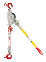 The Lug-All model 3-B is an industrial-grade 1-1/2-ton web strap come along ratchet winch hoist featuring double or single line lift capabilities. This web strap hoist also includes hot-stick rings for electrical lineman work. When used as a single line hoist, this model has 11 feet of web strap and a 1,500-pound capacity. As a double line hoist, this model has 5 feet 6 inches of web strap and a 3,000-pound capacity. All Lug-All web strap hoists are made in the USA and are designed with a double flanged drum to protect the strap. Lug-All web strap hoists also include stress links on the handle that break when the hoist becomes overloaded, protecting the user and equipment.