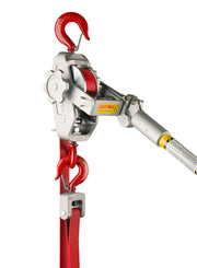 The Lug-All model 25-i is an industrial-grade 1-1/2-ton web strap come along ratchet winch hoist. This hoist features double or single line lift capabilities and an eye bolt main frame—making it great for fast double-line-pull set ups, piggybacking, and storage. When used as a single line hoist, this model has 8 feet of web strap and a 1,500-pound capacity. As a double line hoist, this model has 4 feet of web strap and a 3,000-pound capacity. All Lug-All web strap hoists are made in the USA and are designed with a double flanged drum to protect the strap. Lug-All web strap hoists also include stress links on the handle that break when the hoist becomes overloaded, protecting the user and equipment.